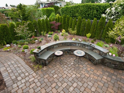 景观设计:弧形矮凳墙 +褐色地砖